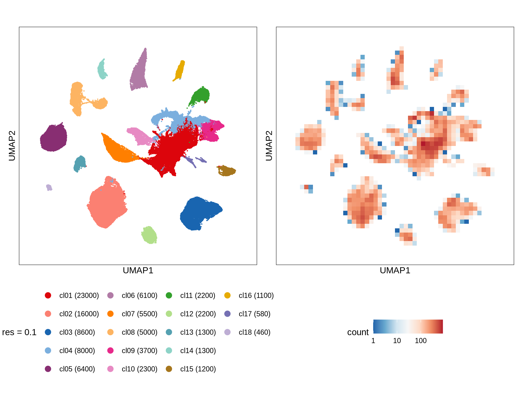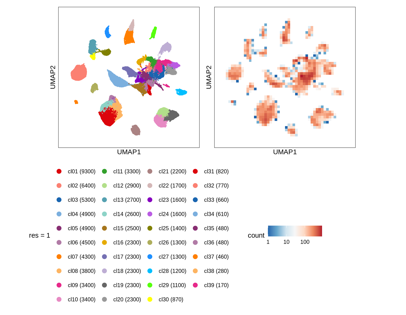 Clustering of data is performed at different resolution values. For each value the clusters are displayed over a UMAP together with a plot showing the density of cells.
