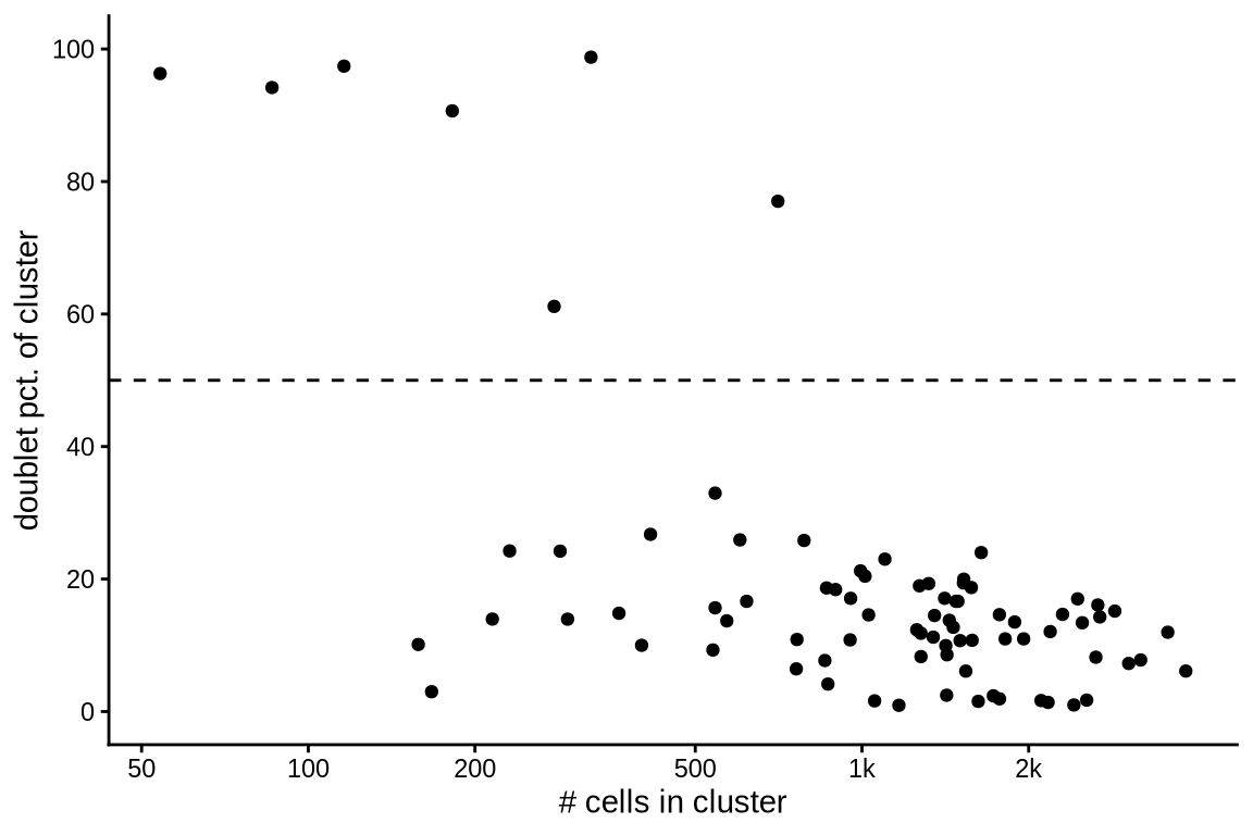 The plot shows the proportion of doublets for each cluster in relation to the total number of cells in that cluster. Clusters with a doublet proportion exceeding 50% are excluded from further analysis.