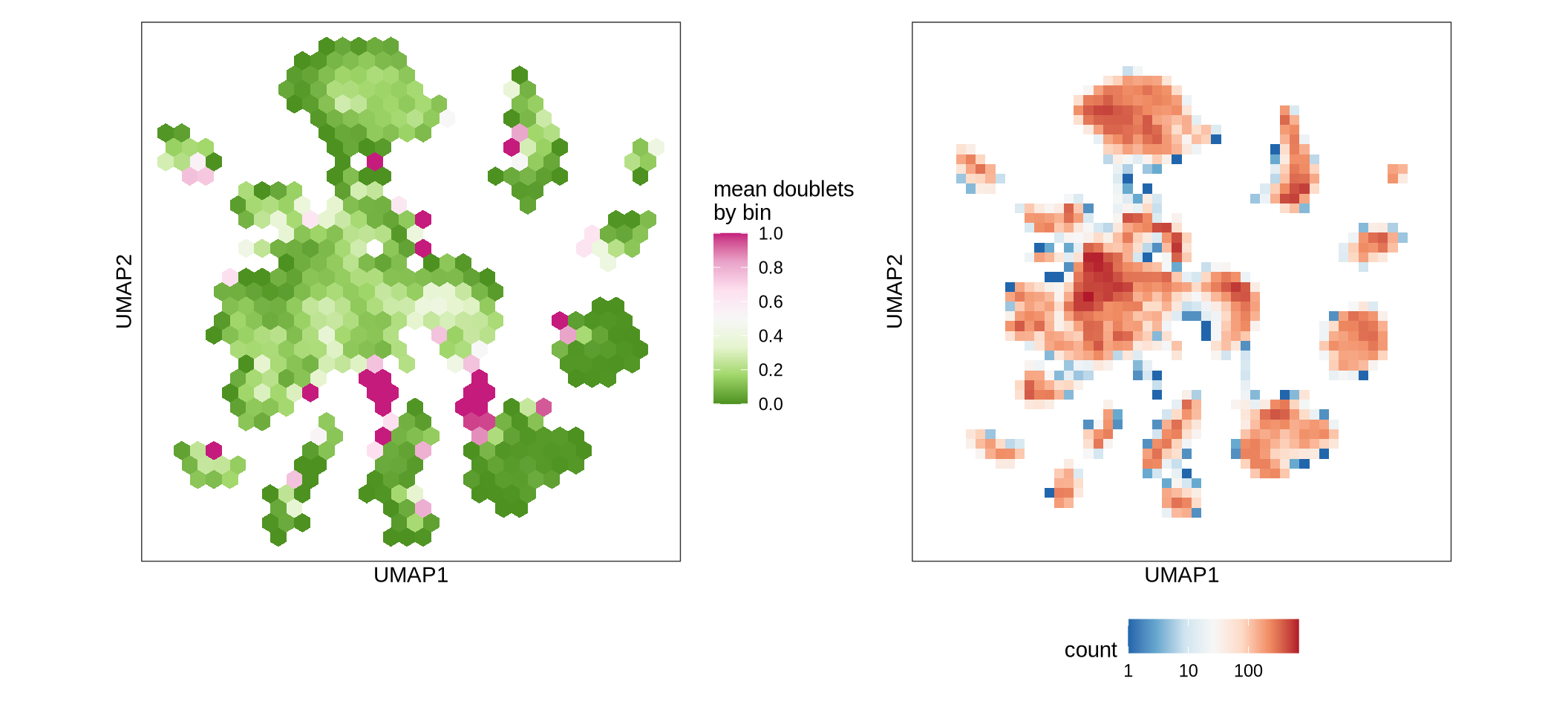 The plot displays a binned UMAP with the proportion of doublets as well as the number of doublets in each bin.