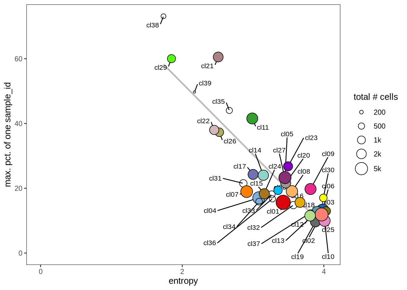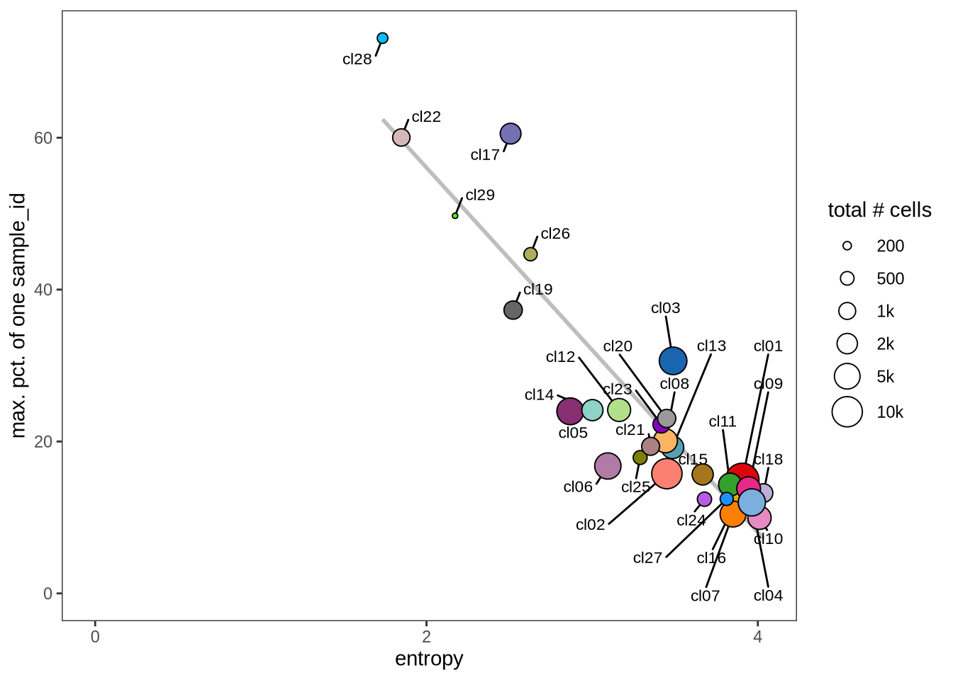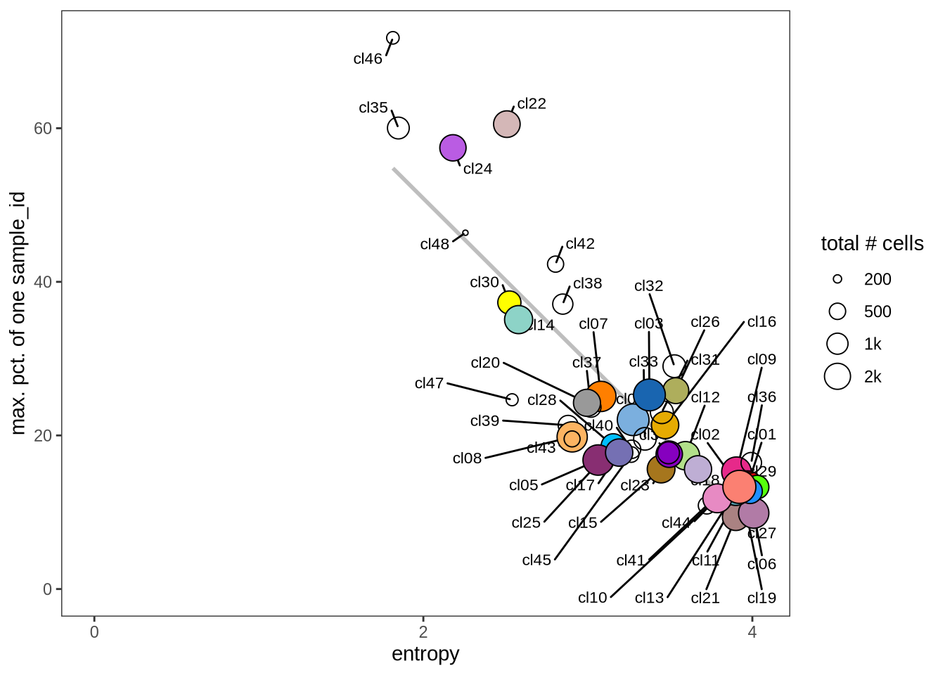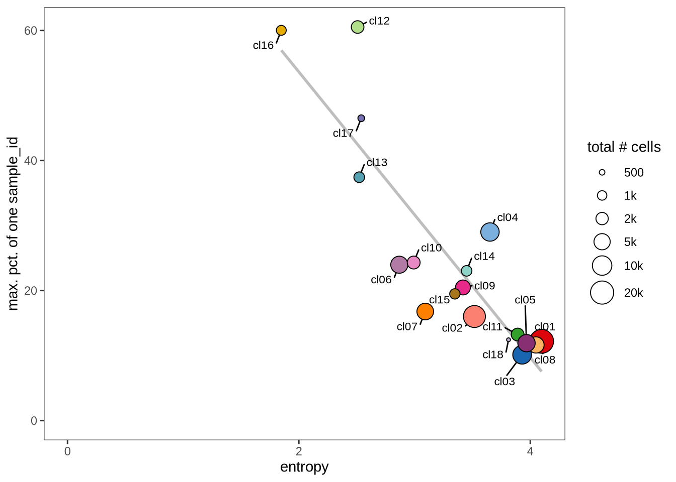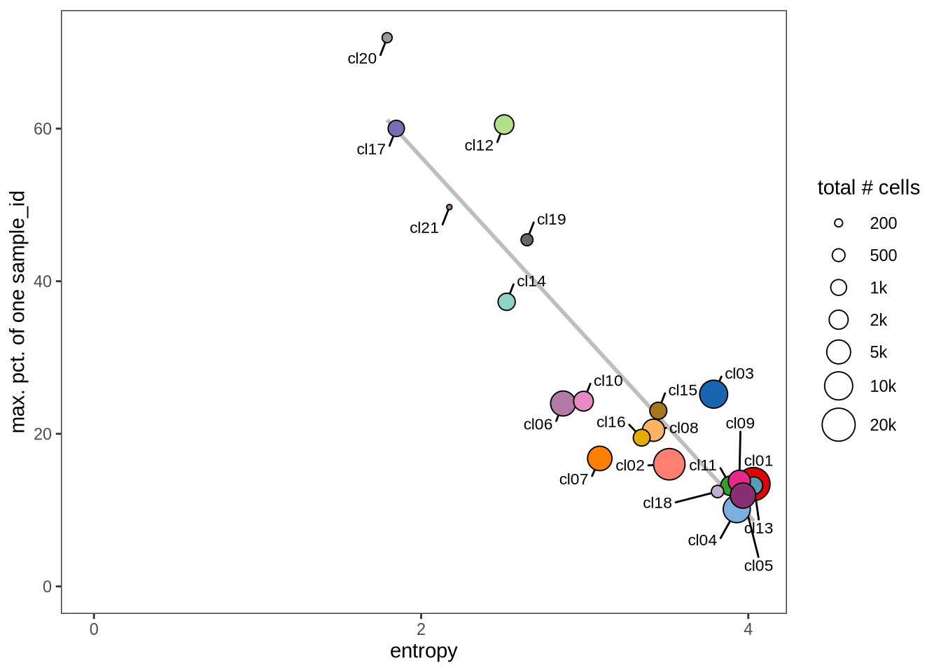This plot visualizes the relationship between the entropy of clusters and the maximum proportion of cells from a single sample within each cluster (higher values suggest that a cluster predominantly contains cells from a single sample). Entropy measures how evenly distributed cells are across samples within each cluster—higher entropy indicates that cells from different samples are more evenly distributed, while lower entropy suggests that a cluster is dominated by cells from a small number of samples.