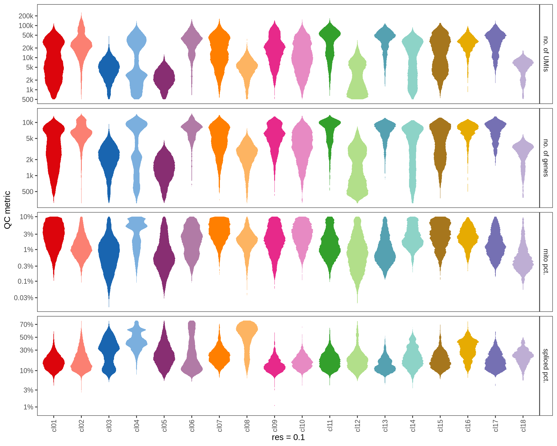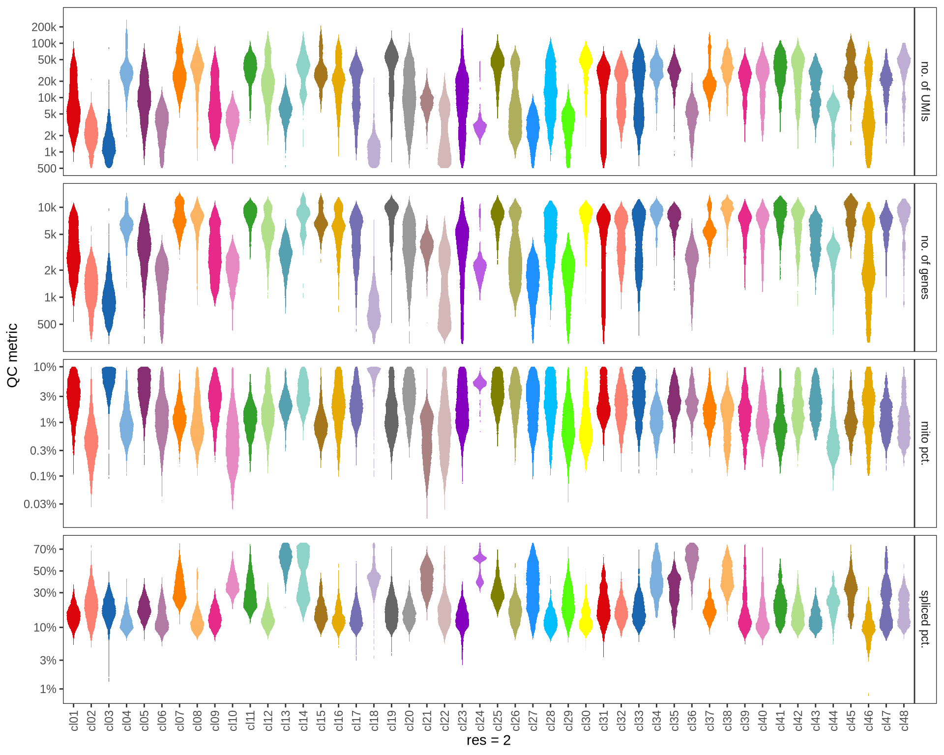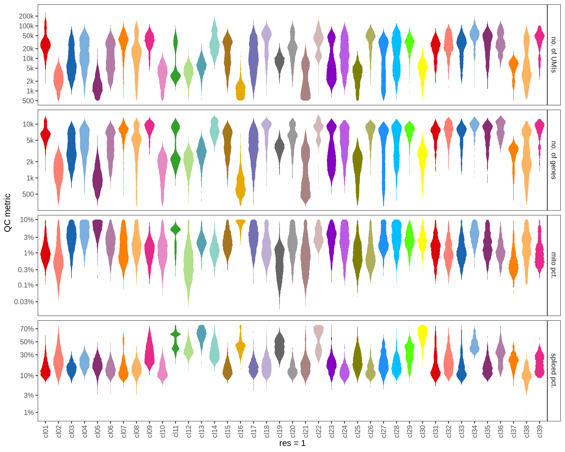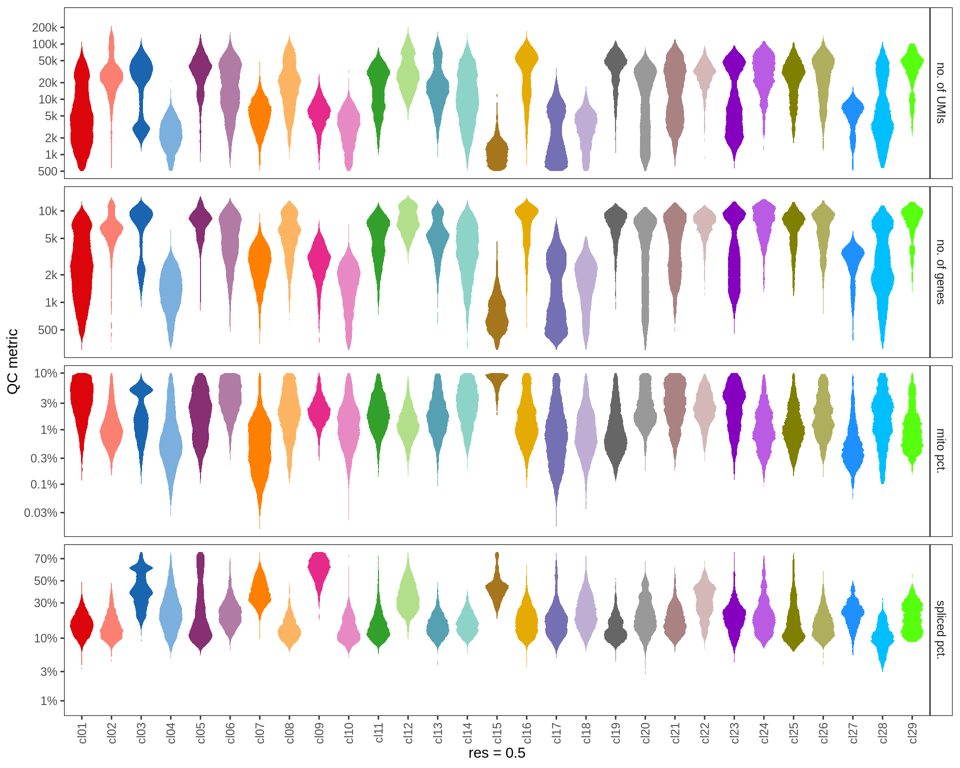 Distributions of QC metrics (library size, number of features, mitochondrial proportion, and spliced proportion) are shown for each cluster across different resolution values.